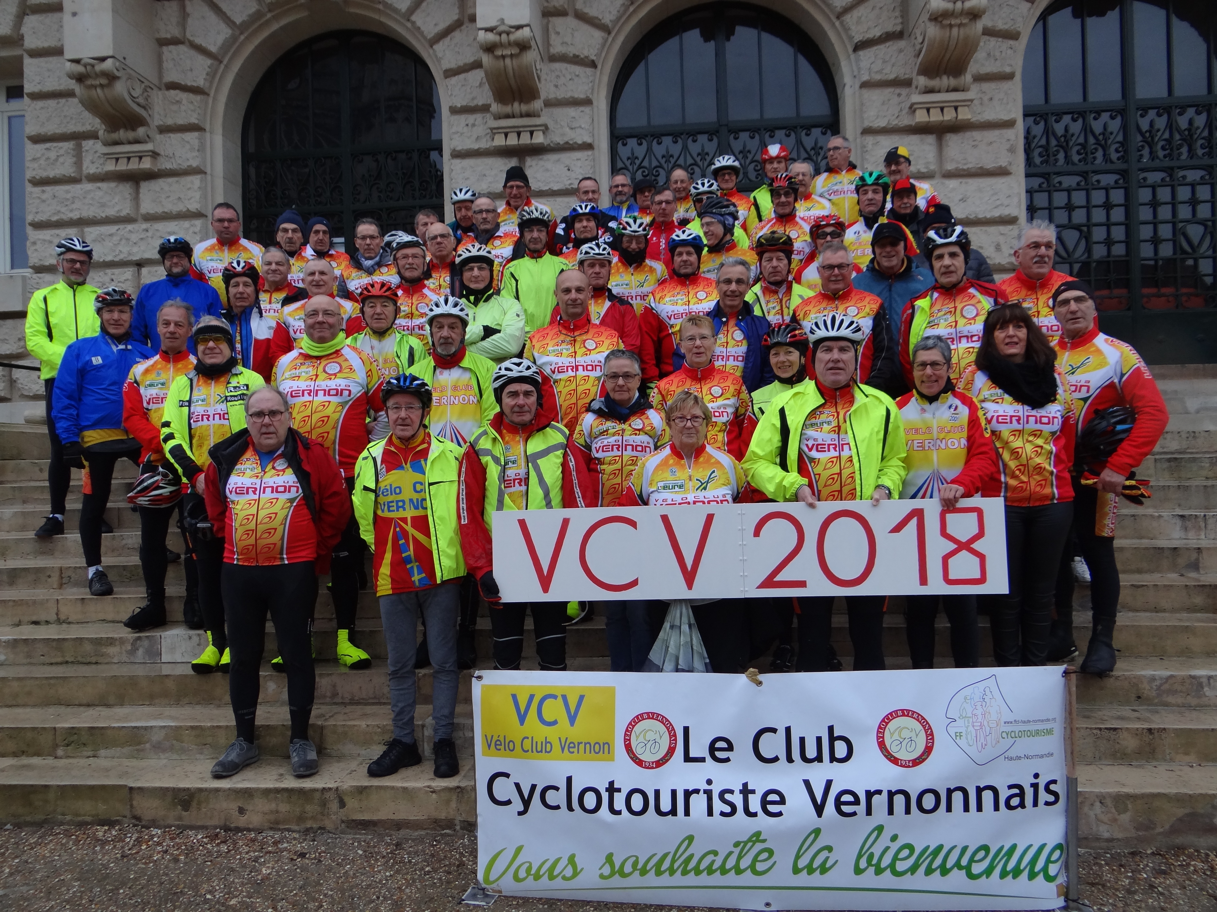 Nous nous sommes retrouvés Dimanche matin avec une météo fraiche mais sans pluie pour la traditionnelle photo d’ouverture de la saison sur les marches de l’Hôtel de ville de Vernon , c’est dans une excellente ambiance qu’une trentaine de cyclos se sont  élancés sur les routes.
