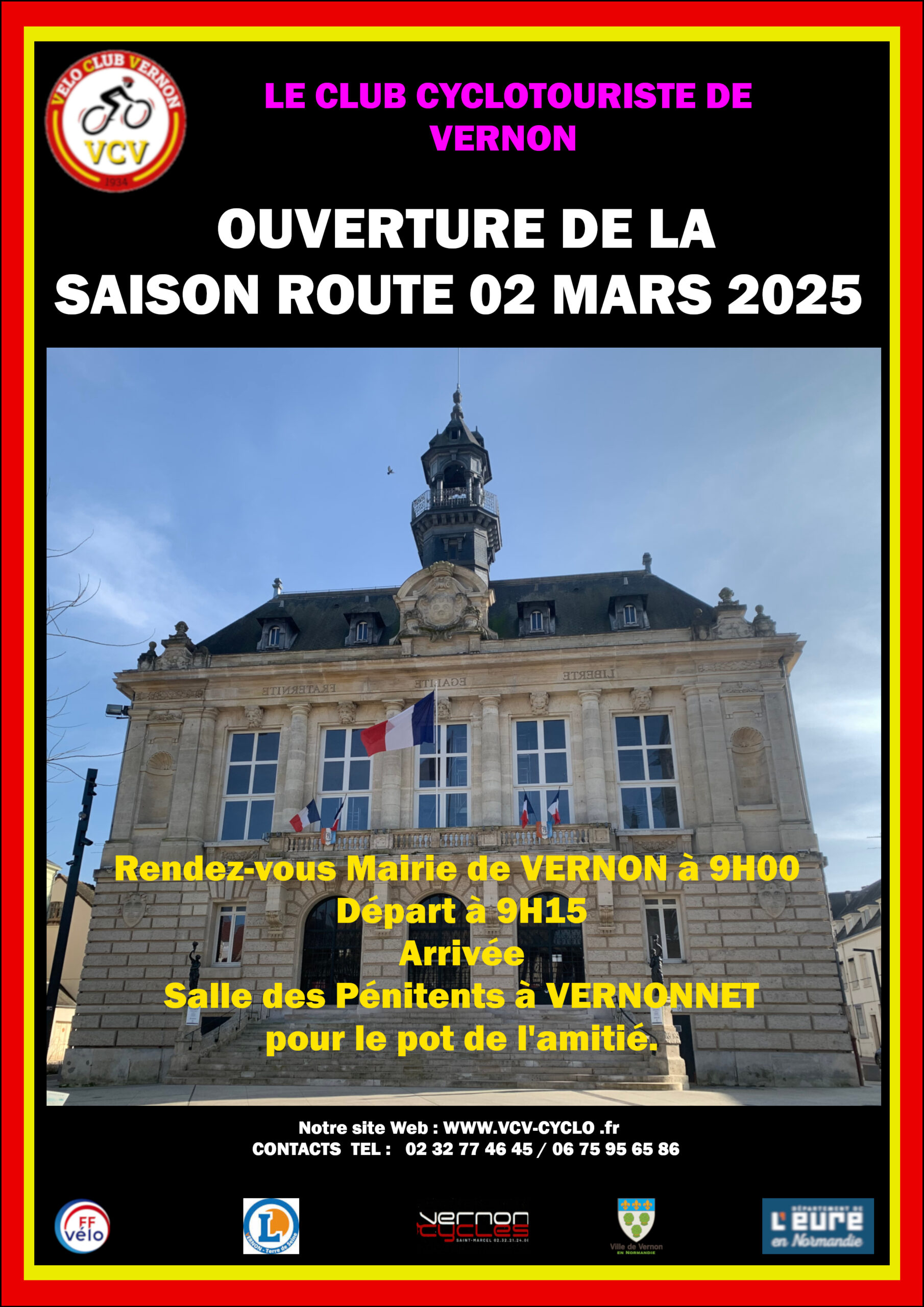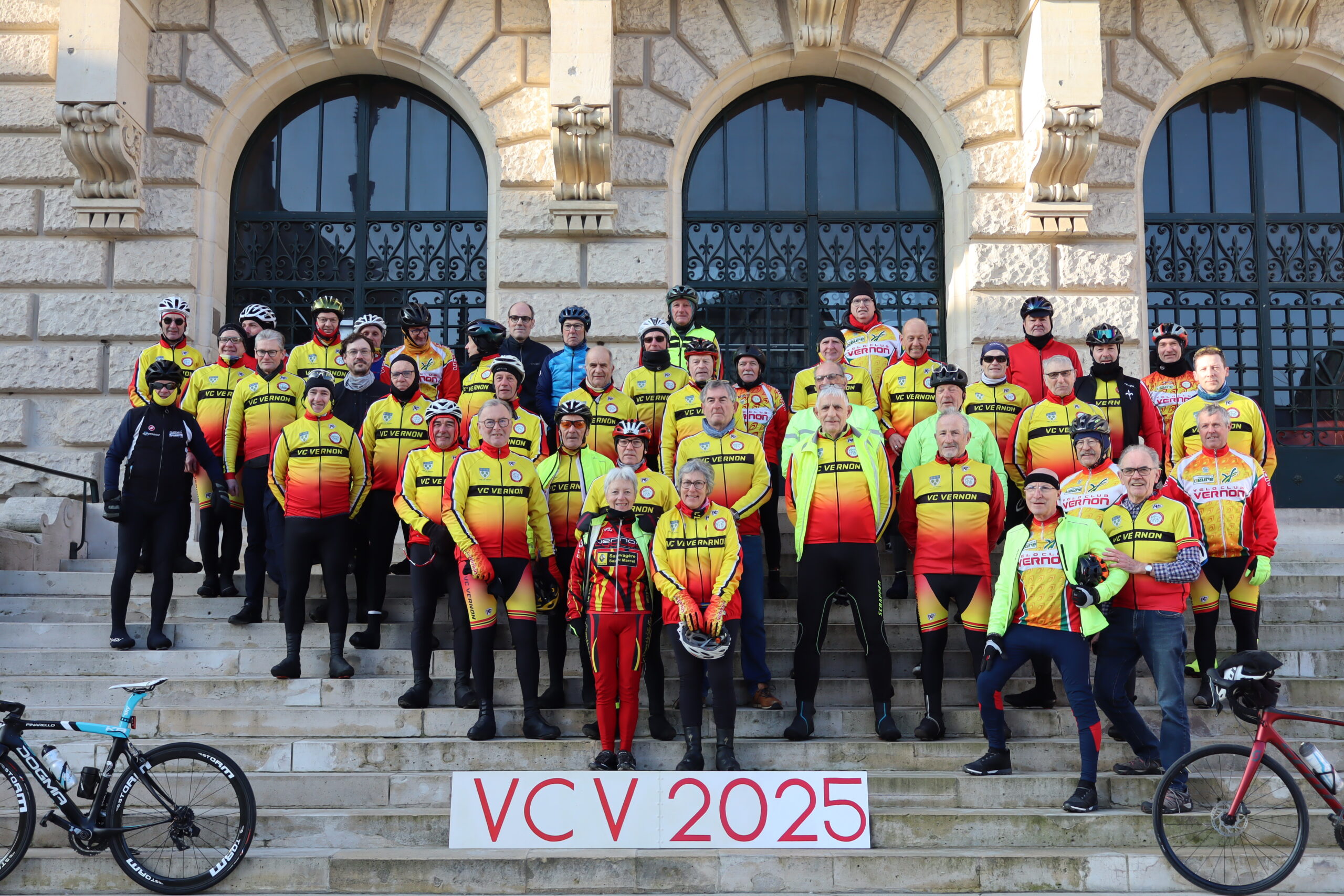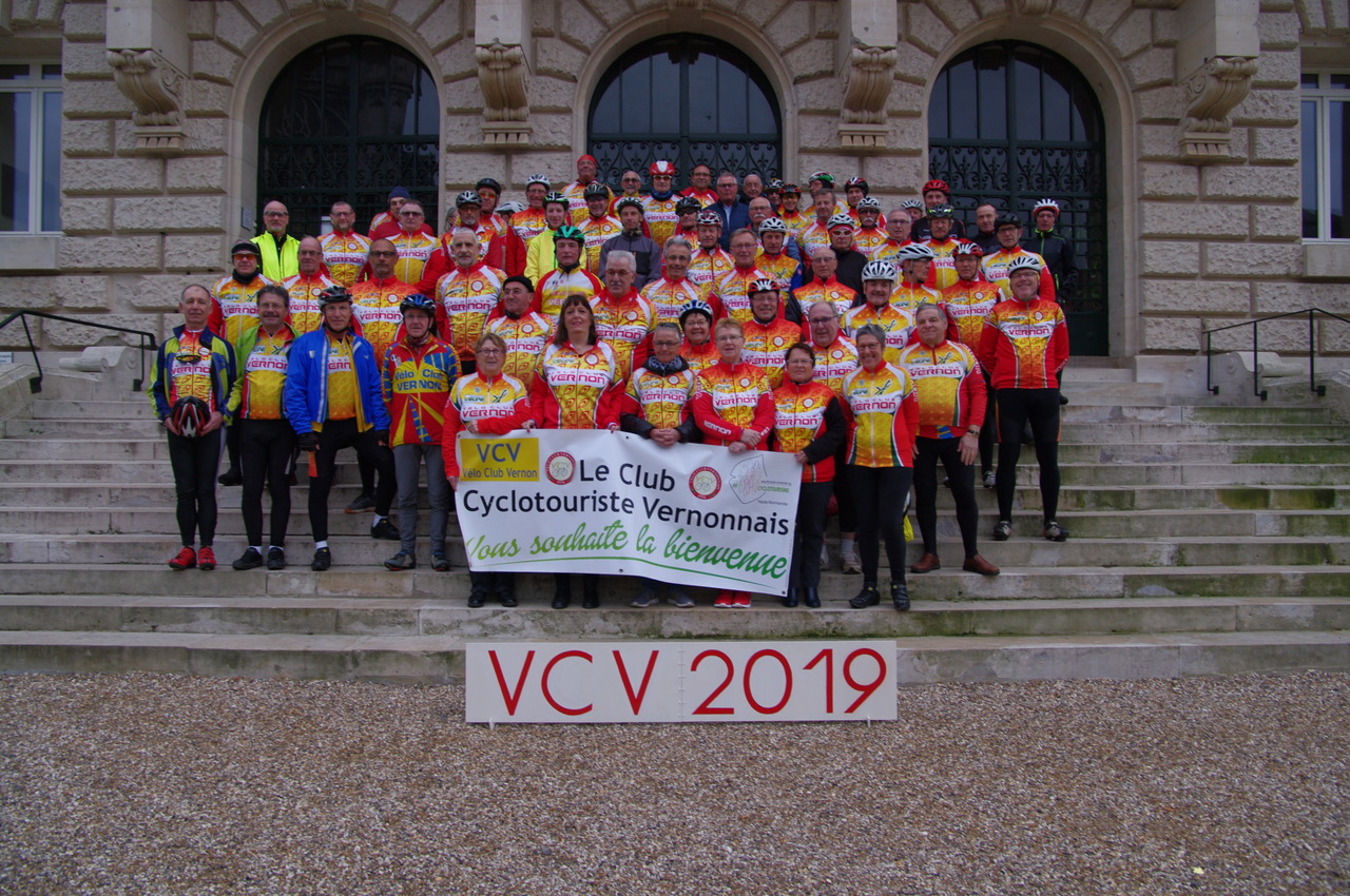 Nous nous sommes retrouvés Dimanche matin avec une météo fraiche mais sans pluie pour la traditionnelle photo d’ouverture de la saison sur les marches de l’Hôtel de ville de Vernon , c’est dans une excellente ambiance qu’une trentaine de cyclos se sont  élancés sur les routes.