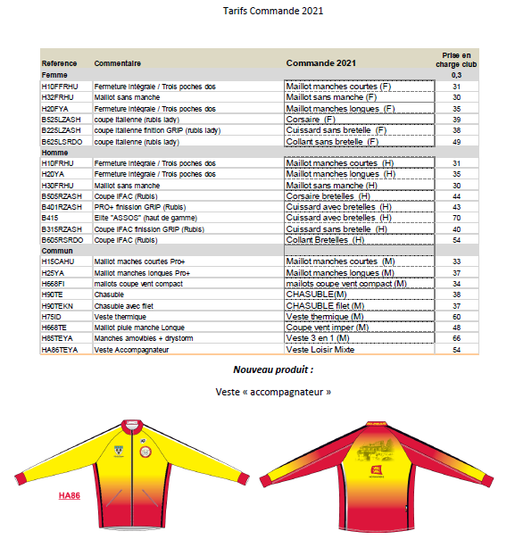 Il est à noter qu’un nouveau produit est proposé, c’est une veste pour les accompagnateurs: veste type survêtement, sans poches arrières, mais deux poches inclinées avant (coupe vent devant, molletonnée ds le dos).
