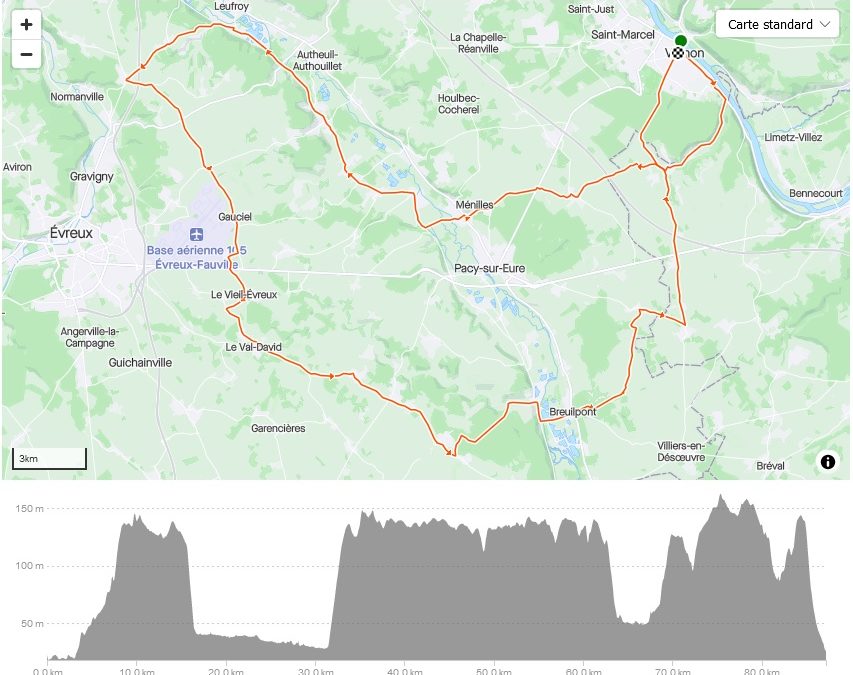 Blaru / Douain / Menille / Gontaine sous Jouy / Vallée de l’Eure / Irreville / Le Boulet Morin (a gauche dir sud) / Sassey / Gauciel / Le viel Evreux / Le Val David / Le Cormier / Boissert / Bretagnolles –> à gauche / Merey / Breuilpont / St Cheron / Villegat –> Vernon
